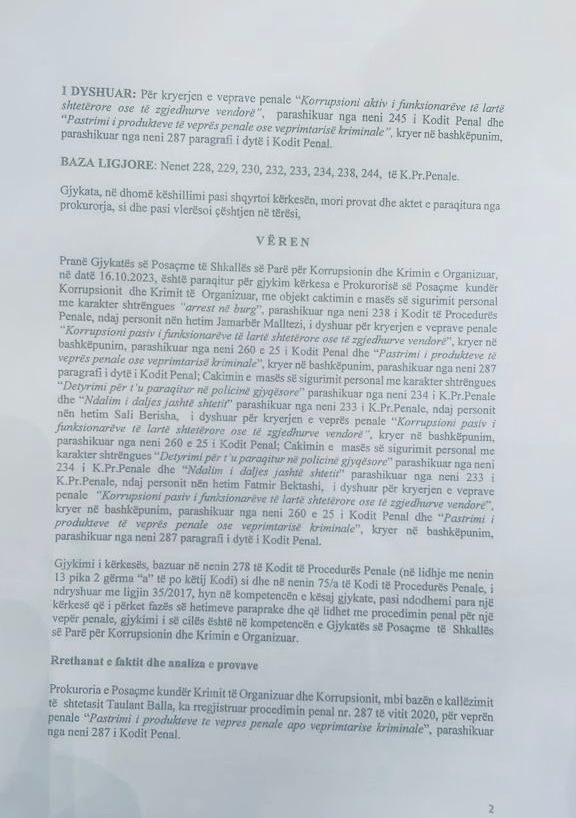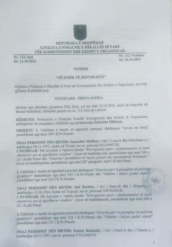 Pranë Gjykatës së Posaçme të Shkallës së Parë për Korrupsionin dhe Krimin e Organizuar. në datë 16.10.2023, është paraqitur për gjykim kërkesa e Prokurorisë së Posaçme kunder Korrupsionit dhe Krimit të Organizuar, me objekt caktimin e masës së sigurimit personal me karakter shtrëngues “arrest ne burg, parashikuar nga neni 238 i Kodit të Procedurës Penale, ndaj personit nën hetim Jamarbër Malltezi, i dyshuar për kryerjen e veprave penale “Korrupsioni pasiv (funksionareve te larte shtetërore ose të zgjedhurve vendore, kryer në bashkëpunim, parashikuar nga neni 260 + 25 i Kodit Penal dhe “Pastrimi i procedurve te veprës penale ose veprimtarisë kriminale”, kryer në bashkëpunim, parashikuar nga neni 287 paragrafi i dytë i Kodit Penal; Caktimin e masës së sigurimit personal me karakter shtrëngues “Detyrimi për t’u paraqitur në policin gjyqësore” parashikuar nga neni 234 i K.Pr.Penale dhe “Ndalimi daljes jashtë shteri” parashikuar nga neni 233 i K.Pr.Penale, ndaj personit nën hetim Sali Berisha, dyshuar për kryerjen e veprës penale “Korrupsioni pariv funksionareve te larte shtetërore ose zgjedhurve vendore, kryer në bashkëpunim, parashikuar nga neni 260 e 25 i Kodit Penal; Caktimin e masës së sigurimit personal me karakter shtrëngues “Detyrimi për t’u paraqitur në policinë gjyqesore” parashikuar nga neni 234 i K.Pr.Penale dhe “Ndalimi daljes jashte shtetit parashikuar nga neni 233 1 K.Pr.Penale, ndaj personit nën hetim Fatmir Bektashi, i dyshuar për kryerjen e veprave penale “Korrupsioni pasiv i funksionareve te larte shtetërore ose te zgjedhurve vendore”, kryer në bashkëpunim, parashikuar nga neni 260 e 25 i Kodit Penal dhe “Pastrimi produkteve të veprës penale ose veprimtarisë kriminale”, kryer në bashkëpunim, parashikuar nga neni 287 paragrafi i dytë i Kodit Penal.